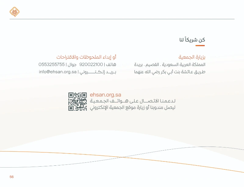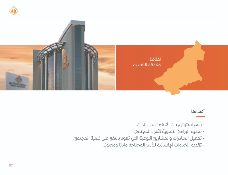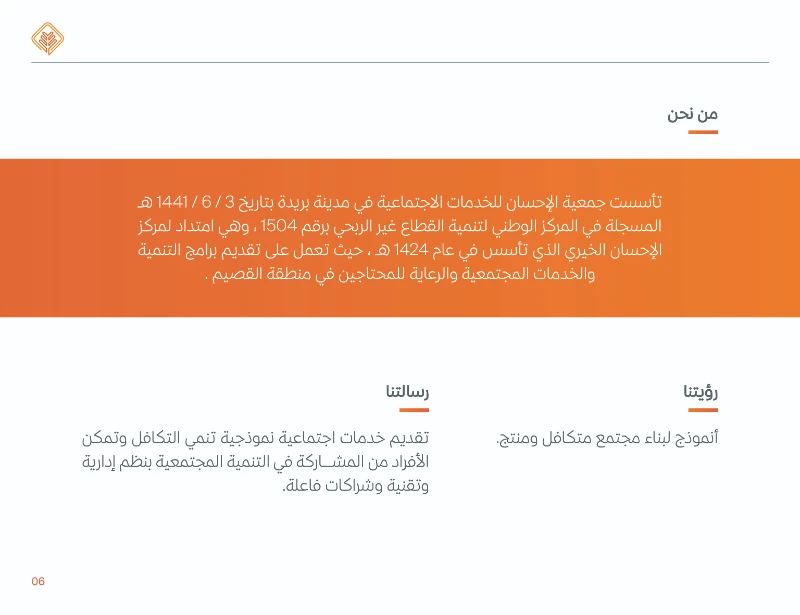 عن الجمعية: تأسست في مدينة بريدة عام 1441هـ (كامتداد لمركز الإحسان الخيري المؤسس عام 1424هـ)، وتهدف إلى بناء مجتمع متكافل ومنتج في منطقة القصيم