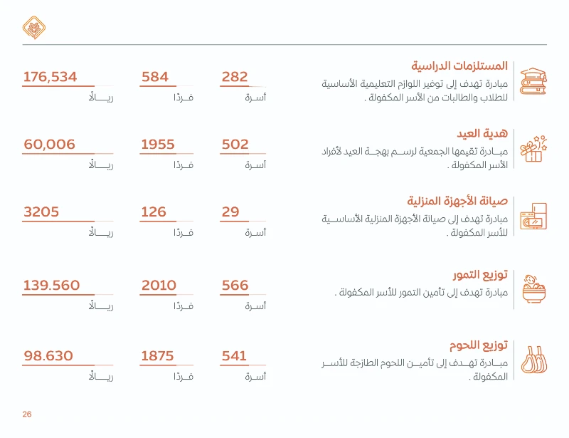 10 .تضمنت هذه الخدمات: السلال الغذائية، تأمين الاحتياجات الضرورية للمنازل، سداد إيجارات المساكن (أجرة مسكني)، وتأمين مستلزمات المواليد